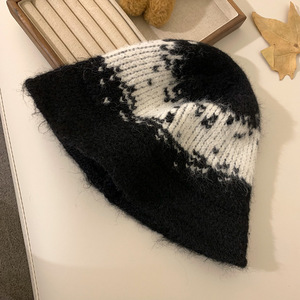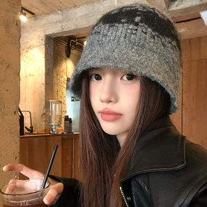 复古小众提花针织毛线帽女秋冬季显脸小水桶帽百搭保暖羊毛渔夫帽