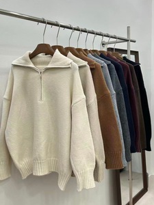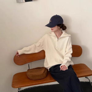 外贸翻领半拉链厚女套衫秋冬新款慵懒风休闲气质针织衫毛衣女上衣