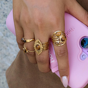 万兴欧美圆形虎眼石开口戒指复古高级感18K金不锈钢手饰品指环