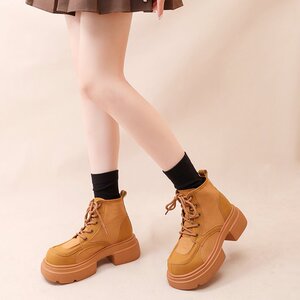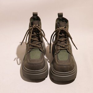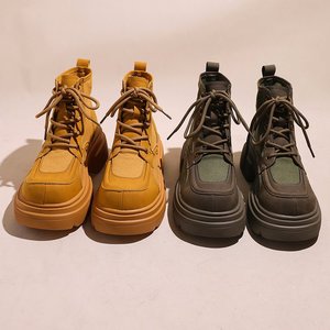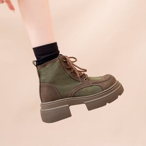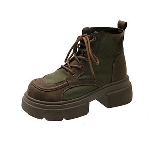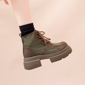 2025秋冬季新款厚底马丁靴女绿色薄款拼接复古系带英伦风骑士短靴