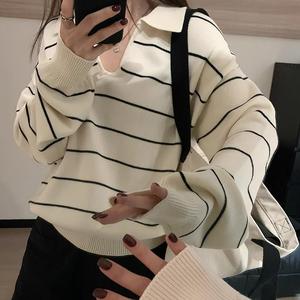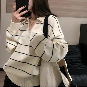 条纹Polo领羊毛针织衫女秋冬季新款设计感宽松慵懒打底套头毛衣