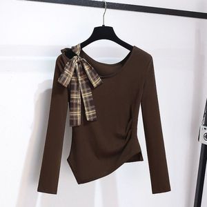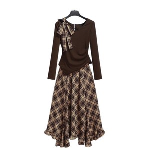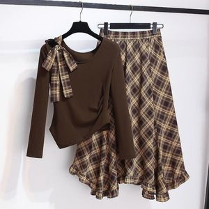 不规则斜肩长袖系带上衣格纹半身裙女套装薄款2025早秋新款连衣裙