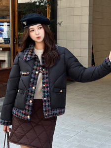 棉服女小香风格子撞色拼接防寒服显瘦洋气保暖棉袄短款外套小棉衣