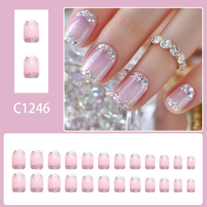短款亮面方甲欧美跨境外贸裸粉纯欲闪粉法式爆闪可拆卸穿戴甲24片