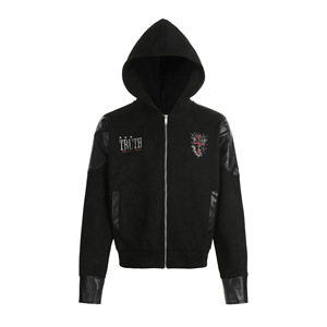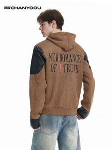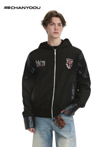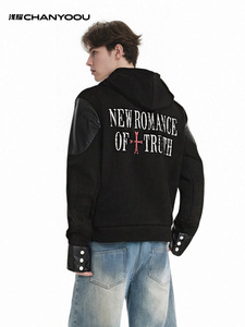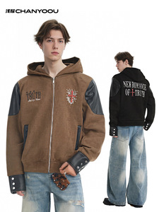 浅耀男装|美式复古重磅vibe皮质盔甲拼接解构夹克男连帽拉链外套