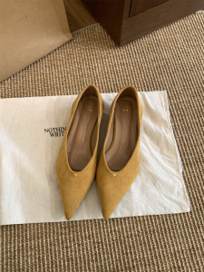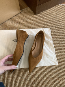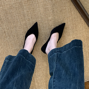 粗跟尖头绒面单鞋女鞋子2025新款夏季法式气质浅口黑色坡跟通勤鞋