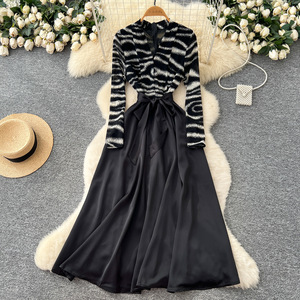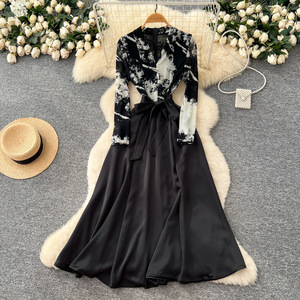 高端优雅气质连衣裙女2025秋季法式网纱印花长袖拼接绑带收腰长裙