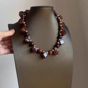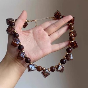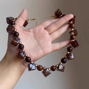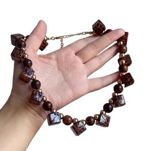 深棕色豹纹方块串珠项链女小众夸张时髦辣妹风锁骨链个性百搭颈链