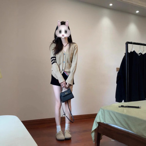 跨境撞色V领软糯毛衣开衫女5春秋季新慵懒学院风针织衫外套衣卡其