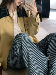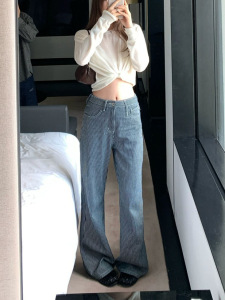 Bankelii'复古航线'牛仔蓝色高腰绑带条纹牛仔直筒裤女