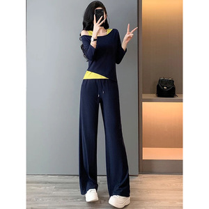 2025流行穿搭一整套女秋季设计感假两件显瘦长袖上衣阔腿裤两件套