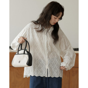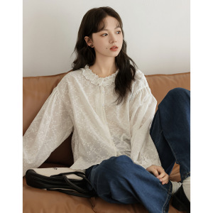 日系森女甜美镂空刺绣衬衫女长袖木耳花边领宽松百搭打底上衣衬衣
