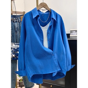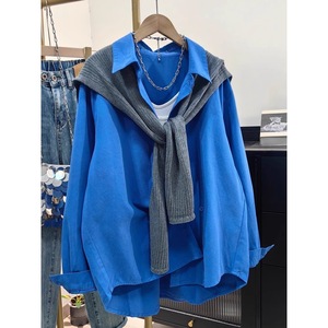 2025早秋季新款韩系克莱因蓝衬衫针织披肩女气质显瘦衬衣外套上衣