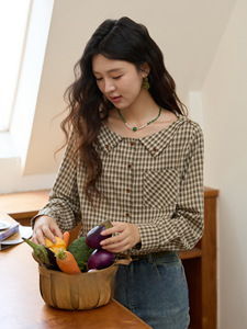 绿格船领衬衫女2025秋季新斜插袋撞色纽扣收腰衬衣上衣
