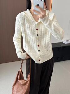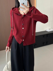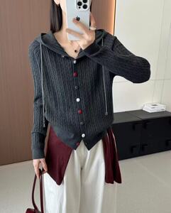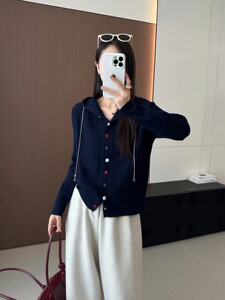 秋款女装秋装法式设计感圆领彩色扣连帽针织开衫毛衣外套百搭上衣