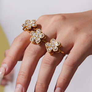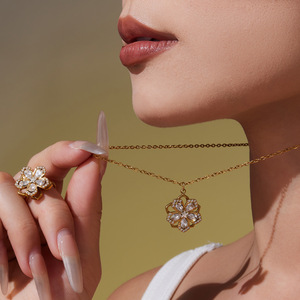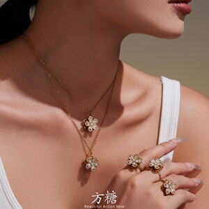 方糖 五叶花锆石360度旋转耳环戒指项链 不锈钢镀18K金首饰套装