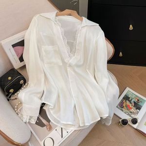 春夏新款简约风新品感白色假两件蕾丝拼接长袖宽松衬衫上衣女2025