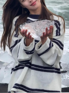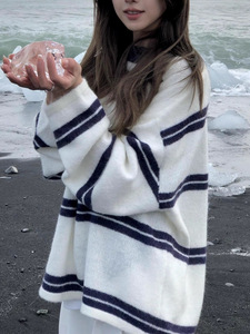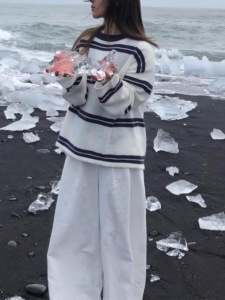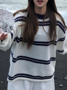 韩系早秋季氛围感穿搭巨好看的套头条纹毛衣针织衫上衣女2025新款