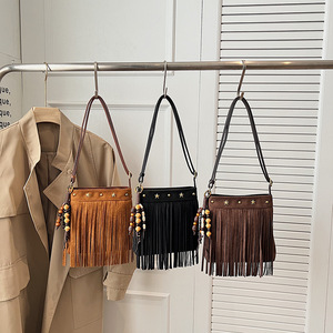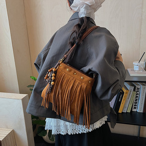 麂皮绒包包女2025新款时尚百搭复古磨砂单肩斜挎包通勤流苏小方包