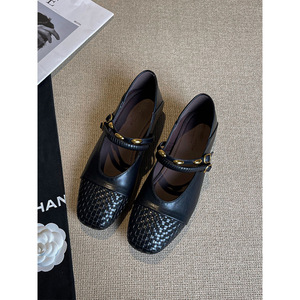 现货羊皮版法式编织玛丽珍鞋女2025新款气质绝美浅口平底黑色单鞋