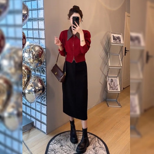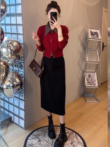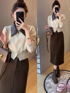 韩系穿搭时尚套装裙秋季显瘦气质减龄拉链针织毛衣半身裙子两件套