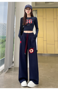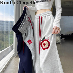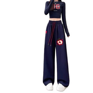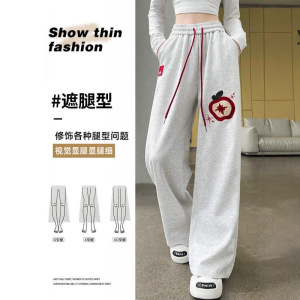 撞色苹果植绒绣运动风休闲裤直筒女秋季今年流行宽松阔腿梧桐卫裤