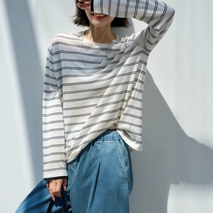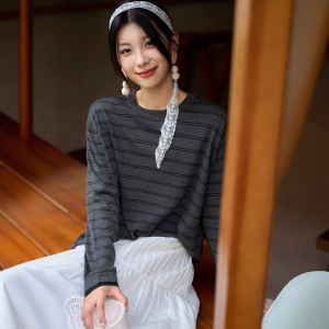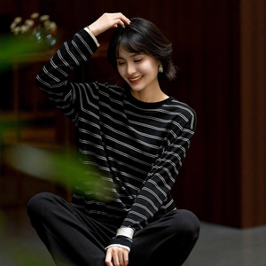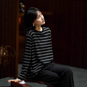 专柜亲肤垂坠超细33羊毛混纺复古条纹圆领廓形针织T恤