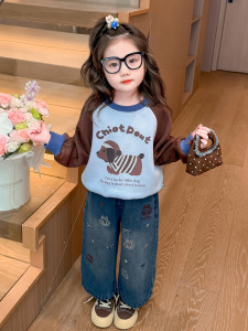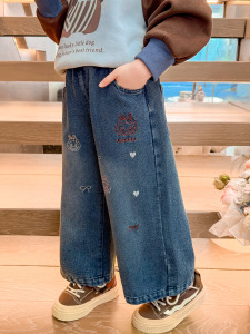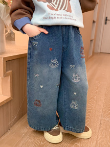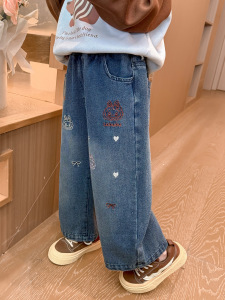 女童牛仔裤春秋装2025新款儿童装洋气小女孩卡通刺绣直筒阔腿裤子