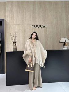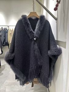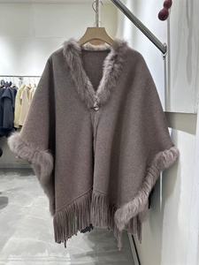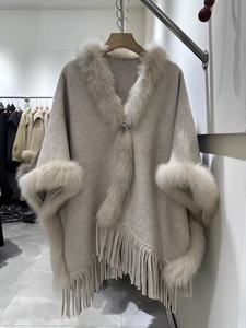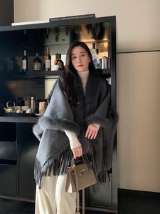 2025秋冬新款狐狸毛流苏披肩斗篷气质羊毛大衣女名媛高级感呢外套