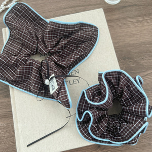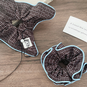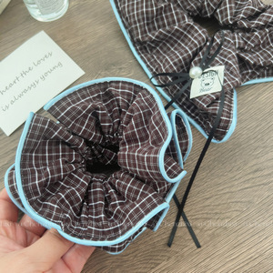 韩系博主同款蓝棕格子束腰大肠发圈可爱小熊丸子头发绳方巾发饰