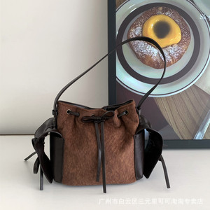 小众设计多口袋蝴蝶结驼绒水桶包2025秋冬新款通勤百搭手提斜挎包