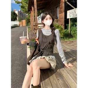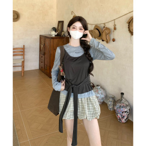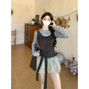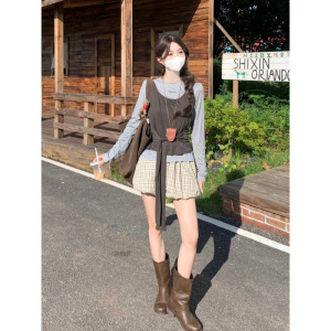 日系学院风绑带背心字母刺绣T恤格纹花苞裙三件套女辣妹短裙套装
