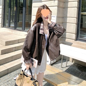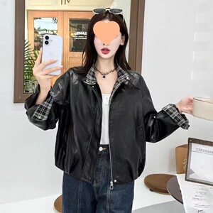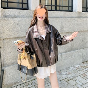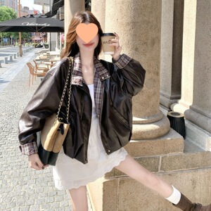 短款格子拼接洋气皮衣外套女2025秋季新款小个子复古机车夹克上衣