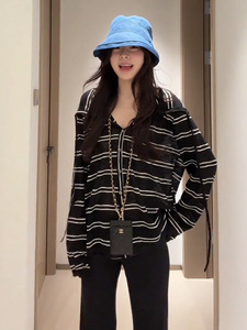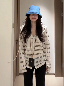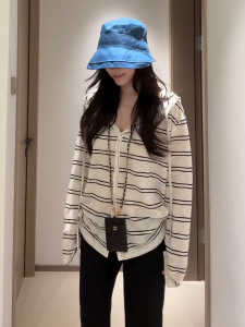 早秋条纹连帽开衫女韩版宽松慵懒风防晒长袖百搭上衣纽扣外套2025