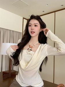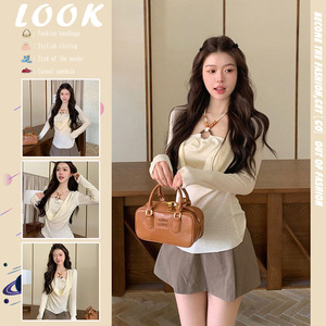 法式气质荡领绑带挂脖假两件长袖女早秋季时尚百搭设计感串珠上衣