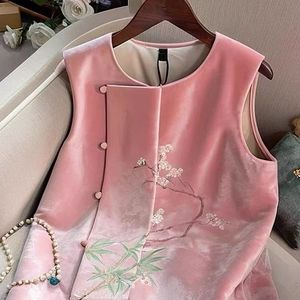 新中式粉色丝绒复古盘扣马甲背心2025刺绣新款中式无袖国风上衣