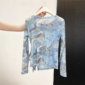 2025秋季新款空调衫慵懒上衣蓝色晕染侧边绑带收腰长袖防晒t恤女