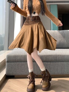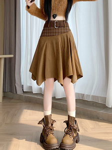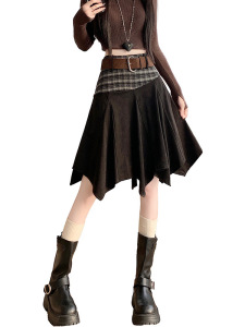 老钱风复古格纹拼接半身裙女秋季2025新款不规则高腰中长款a字裙