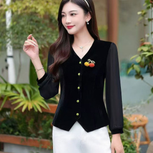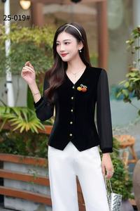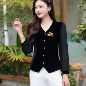 汉派品牌专柜2025秋季收腰显瘦设计感南瓜胸针丝绒拼接长袖812
