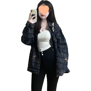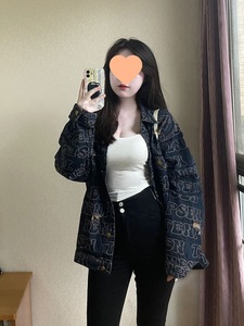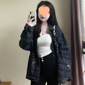 美式复古字母印花牛仔外套女秋冬季新款宽松百搭小众别致翻领夹克
