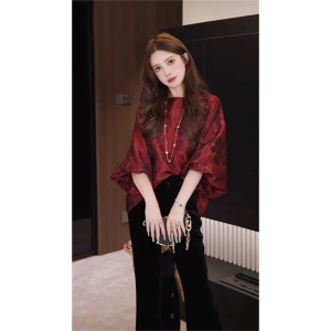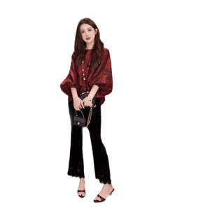 秋季套装女chic港风高级感复古红色印花衬衫气质高腰微喇裤两件套