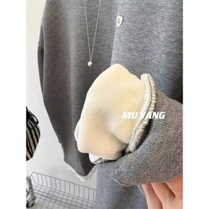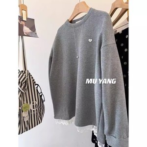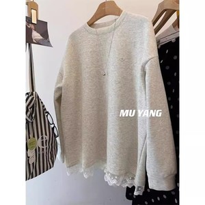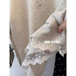 胖mm正肩拼接刺绣蕾丝花边下摆卫衣女秋冬新款圆领爱心加绒上衣潮