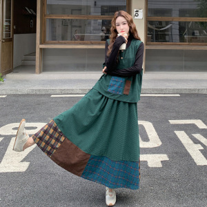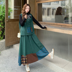 实拍绿色格子个性撞色拼接套装裙25秋氛围感马甲打底衫半裙三件套
