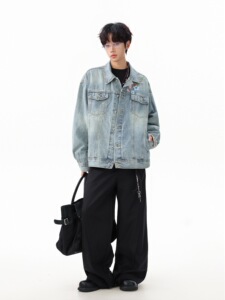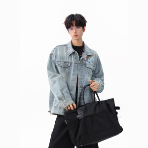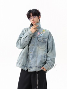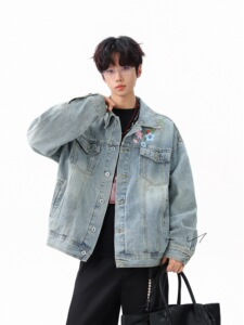 美式花卉刺绣牛仔夹克男女秋冬季宽松翻领外套水洗廓形纽扣上衣潮