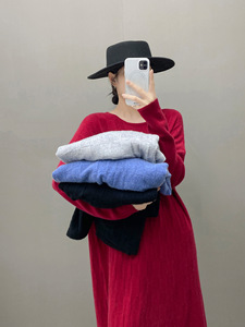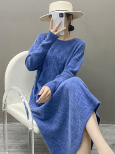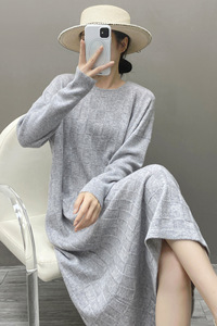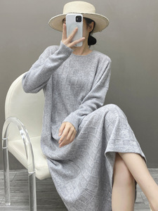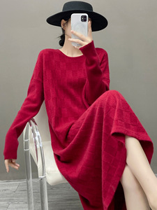 新款秋冬山羊绒裙子女圆领毛衣连衣裙麻花纹直筒中长款羊绒打底衫