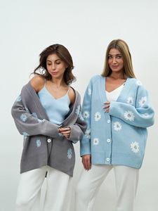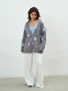 速卖通热销2025秋冬新款宽松慵懒风垂坠感小花刺绣V领开衫毛衣女