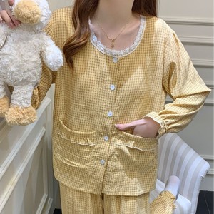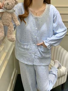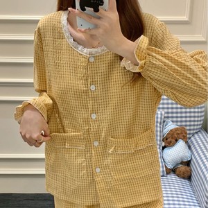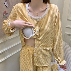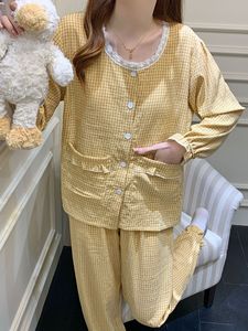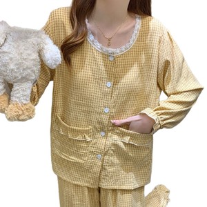 带胸垫睡衣女春秋季韩系甜美格子花边云朵棉长袖家居服套装可外穿