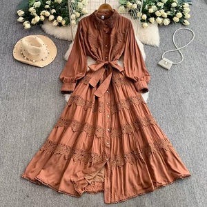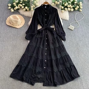 法式温柔风粉色重工蕾丝拼接娃娃领连衣裙女春秋排扣收腰显瘦长裙
