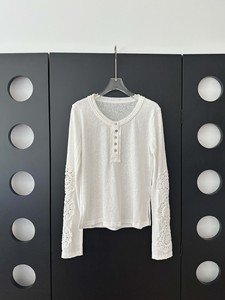 瀚柯 复古慵懒 袖子蕾丝钩花拼接亨利领长袖T恤