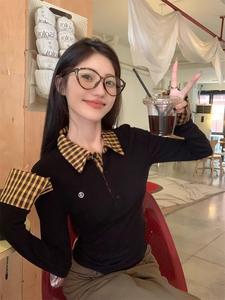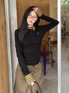 学院风格纹polo领拼接假两件长袖t恤女秋冬内搭修身显瘦打底上衣